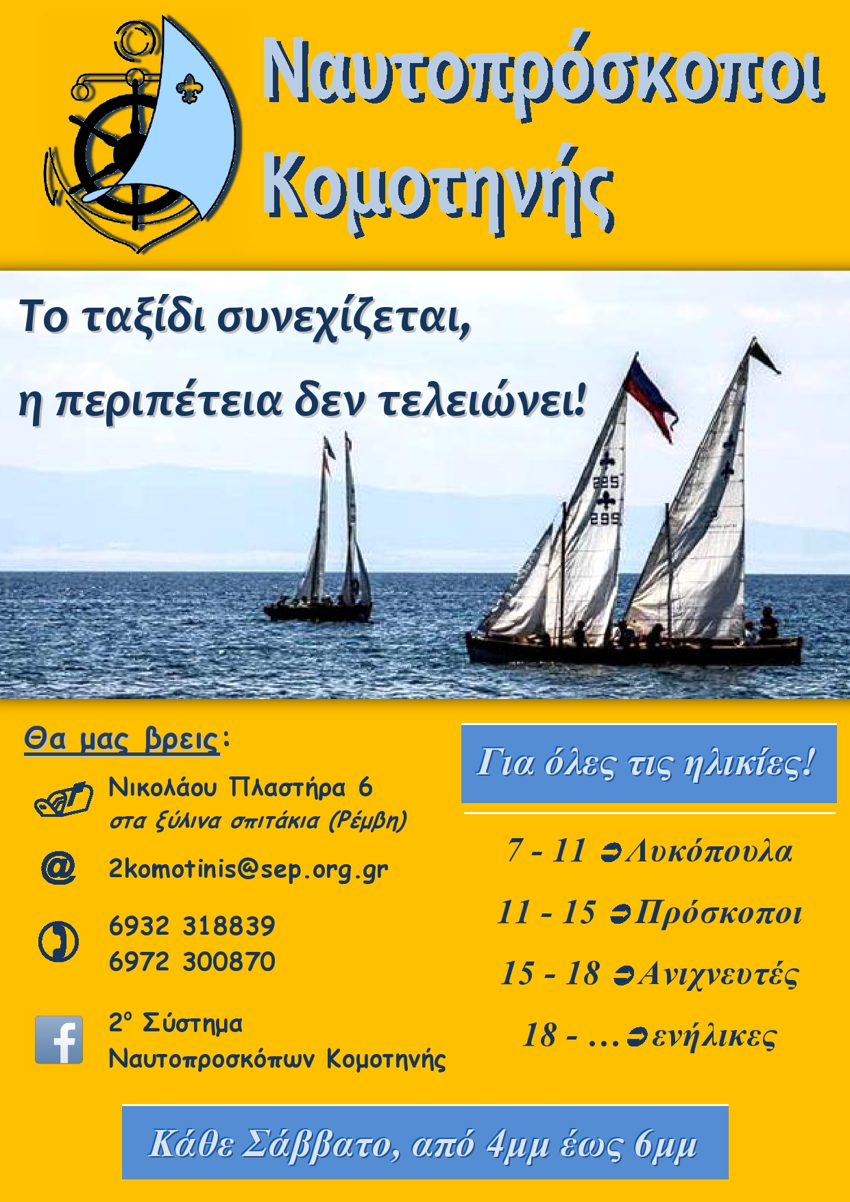 Το Σάββατο 13 Σεπτεμβρίου στην κεντρική πλατεία της πόλης, οι Ναυτοπρόσκοποι Κομοτηνής θα περιμένουν, από τις 6μμ και μετά, τους μικρούς και μεγάλους φίλους τους για να γνωρίσουν το Προσκοπικό Χωριό! Εκεί, όλα τα παιδιά ανεξαρτήτως ηλικίας, θα έχουν την ευκαιρία να απασχοληθούν δημιουργικά σε εργαστήρια χειροτεχνίας (πυρογραφία, κατασκευές κα) αλλά και να παίξουν γνωστά επιτραπέζια παιγνίδια (score4, jenga, jungle, speed) σε XL έκδοση.