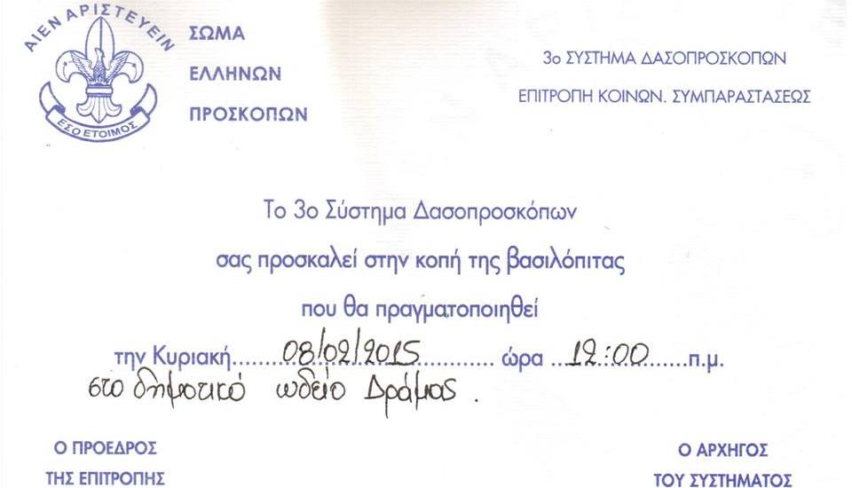 Σας προσκαλούμε την Κυριακή 08/02/2015 και ώρα 12:00 στην κοπή της πίτας του 3ου Συστήματος Προσκόπων Δράμας που θα πραγματοποιηθεί στο Δημοτικό Ωδείο Δράμας.