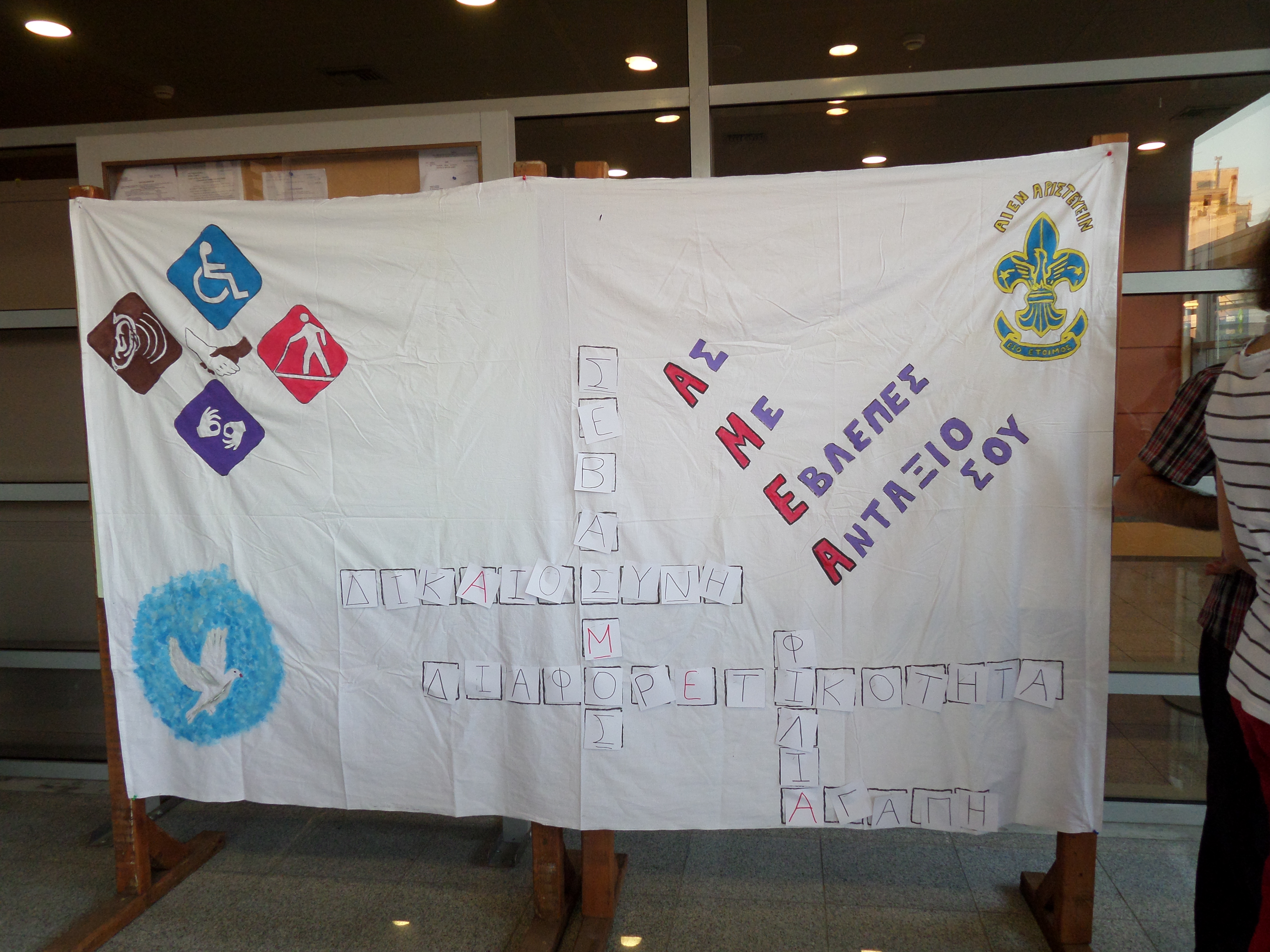 Τα άτομα με αναπηρία(ΑμεΑ) χωρίστηκαν σε τέσσερις μικρές ομάδες και περνούσαν κυκλικά απο τους 4 σταθμούς και έπαιζαν απο ένα παιχνίδι στον κάθε σταθμό. Απο τους σταθμούς μάζευαν κάποιες λέξεις όπου στο τέλος τις συμπλήρωσαν στο σταυρόλεξο που ήταν στο κεντρικό πανό. Τα περιεχόμενο των παιχνιδιών έιχε να κάνει με τις ανθρώπινες αισθήσεις.