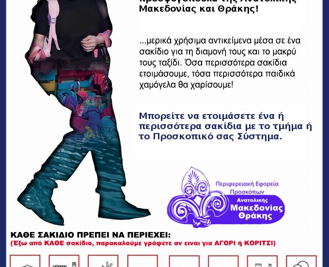 Πρόκειται για μια δράση διανομής παιδικών σακιδίων σε μικρούς πρόσφυγες και που ξεκίνησε η ομάδα Προσφοράς και Αλληλεγγύης ΠΑΡΕΑ .