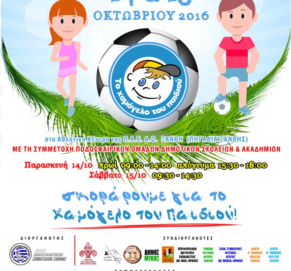 Ο Εθελοντικός Οργανισμός για τα παιδιά «Το χαμόγελο του παιδιού», σας προσκαλεί την Παρασκευή 14 και το Σάββατο 15 Οκτωβρίου 2016, να παρακολουθήσετε το 1ο Πανξανθιώτικο παιδικό Ποδοσφαιρικό τουρνουά, μεταξύ δημοτικών σχολείων και Ακαδημιών όλου του Νομού, στις εγκαταστάσεις του Αθλητικού Κέντρου της Π.Α.Ε. Α. Ο. Ξάνθης στα Πηγάδια, με σκοπό την οικονομική ενίσχυση των δράσεων του εθελοντικού Οργανισμού.