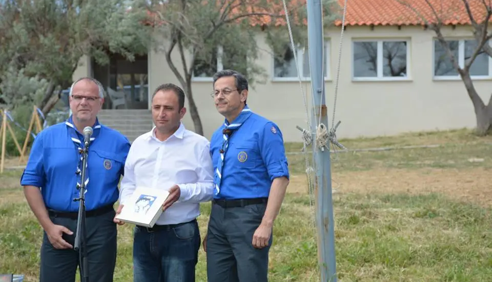 Η φωτογραφία με τον Άγγελο στο κέντρο να βραβεύεται από το Σώμα Ελλήνων Προσκόπων για την συμβολή του κατά την διάρκεια των εγκαινίων της Αλκυώνας.